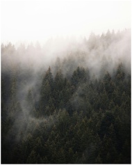 A serene misty forest with conifer trees enveloped