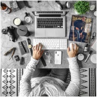 Overhead view of an organized desk with tech gadgets, fashion magazine, and accessories for modern working lifestyle.