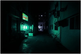 Dark alleyway at night featuring an eerie neon-lit shop, creating a mysterious urban atmosphere.