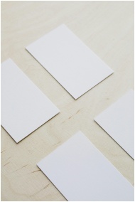 From above of white mockup rectangular visiting cards arranged neatly on wooden table