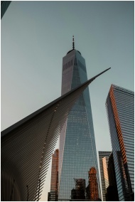 A stunning low angle view of One World Trade Center and the Oculus in New York City at dusk.