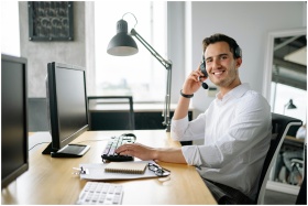 Smiling call center agent working at a desk with a headset and computer in a modern office.