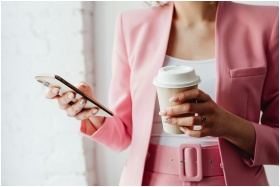 Fashionable woman with coffee cup and phone in a pink suit indoors.