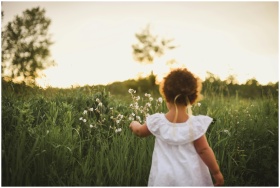 Young girl in a white dress exploring a sunlit summer field with wildflowers.