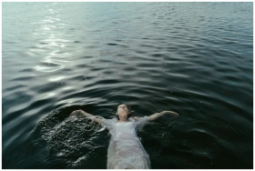 A woman peacefully floating in calm water, exuding tranquility and freedom.