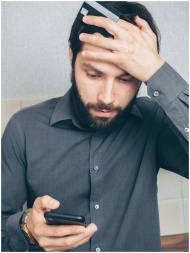 A stressed man looks at his smartphone, holding a credit card in his hand.