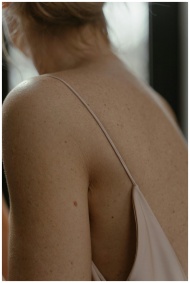 Close-up of a woman's freckled back in soft natural light, highlighting skin texture.