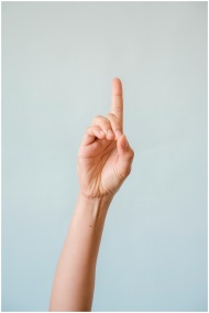 A single hand gesturing upwards against a soft blue background, showing a pointing finger.