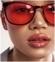 Stylish close-up portrait of a woman wearing red sunglasses and pink lipstick.