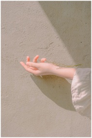 A delicate hand extends towards a sunlit wall, capturing subtle textures and shadows.