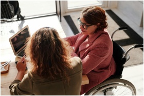 Two women working on laptops, one using a wheelcha