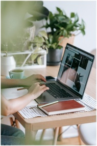 Crop unrecognizable freelancer typing on netbook while sitting at table with notebook and tea cup near potted green plants in light room