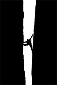Dramatic silhouette of a climber scaling Pennadomo's narrow rock crevice, showcasing strength and balance.