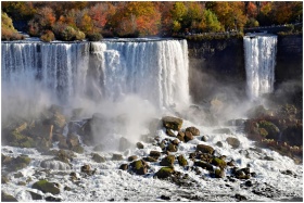 Stunning view of Niagara Falls with vibrant fall foliage and cascading waters.