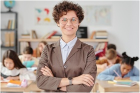 Smiling teacher with glasses standing with arms crossed in a classroom, students learning.