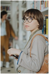 Stylish young woman with glasses browsing books in