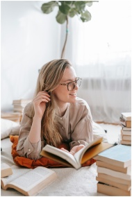 Clever young female lying on cushion and reading near stacks of different books while smiling brightly and looking away