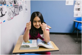 A confident young girl in a classroom giving a thumbs-up while reading a book.