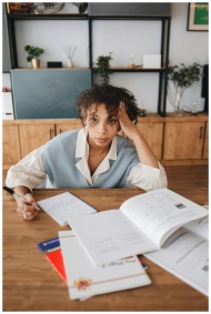A young woman deeply engrossed in studying at a desk, surrounded by books and notebooks.