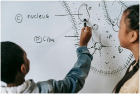 Back view of anonymous multiracial classmates describing primitive organism on whiteboard in classroom