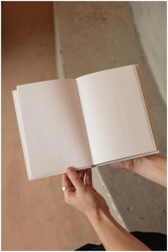 From above of unrecognizable female holding book with blank pages while sitting near stone stairs