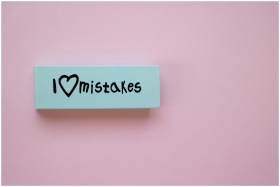Minimalist eraser with 'I Love Mistakes' message on pink background, school stationery.