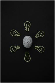 Top view of a brain model surrounded by paper clip light bulbs on black background.