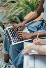 High angle crop faceless young multiracial women sitting in park with open laptop while writing with pencil in notepad