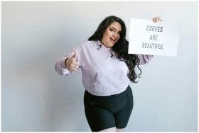 Cheerful plus-size woman holding sign 'Curves Are Beautiful,' promoting self-love.