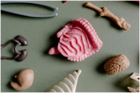 Flat lay of various educational plastic anatomy models including organs and bones for study.
