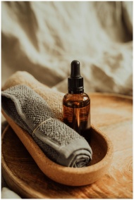 Close-up of a glass amber bottle with massage oil on a wooden tray, set with soft towels for a calming spa experience.