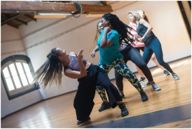 Women engage in a lively dance class in a well-lit studio, enjoying movement and skill.