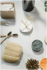 Eco-friendly toiletries including bamboo brushes and natural sponges for sustainable self-care.