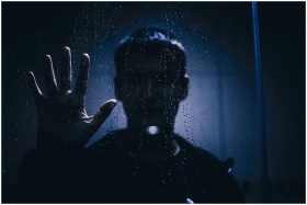 Silhouette of a person with hand against a rain-covered glass, evoking mystery and introspection.