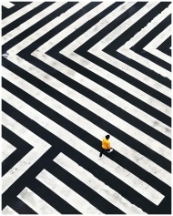 A person in a yellow jacket walks across a striking striped crosswalk from above.