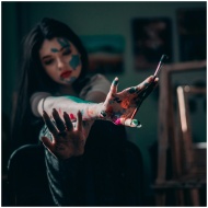 Young woman artist showing creativity with colorful paint on hands in the studio.