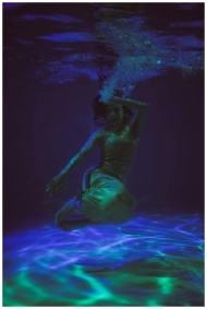 A mesmerizing underwater scene of a dancer submerged in vivid blue and green lights, creating a dream-like atmosphere.
