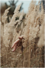 A delicate hand touching brown, dried grass in an outdoor setting, evoking a sense of connection with nature.