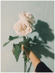 A hand holding two white roses casts a shadow on a