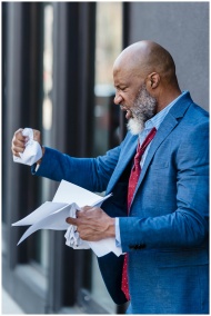 Side view of furious African American male entrepreneur in formal wear with documents in hands standing on street near building