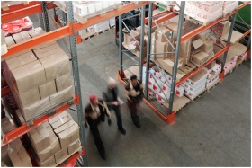 A high angle view of workers in motion in a busy warehouse with shelves full of boxes and packages.