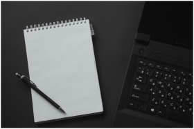 Flat lay of an office workspace with a laptop, notepad, and mechanical pencil on a black background.