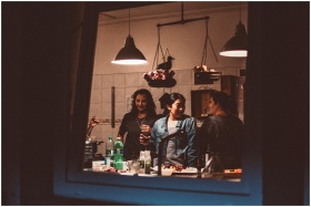 A warm indoor gathering of friends in a kitchen, e