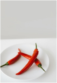 Vibrant red chili peppers on a white plate, showca