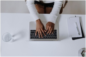 Overhead shot of a woman typing on a laptop in a m