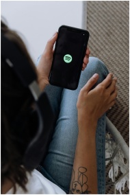 A person listening to music with headphones and smartphone, displaying Spotify logo.