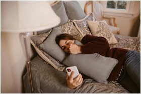 A young woman lying on a bed, holding a phone and