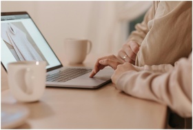 Warm indoor setting featuring a person shopping online on a laptop with a hot drink nearby.