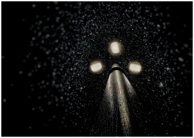 Artistic capture of rain-drenched street lamp illuminating droplets at night in Moscow.