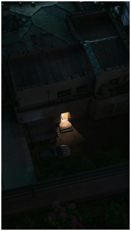 From above of contemporary style building with dark roof and illuminated porch by artificial light at night in town